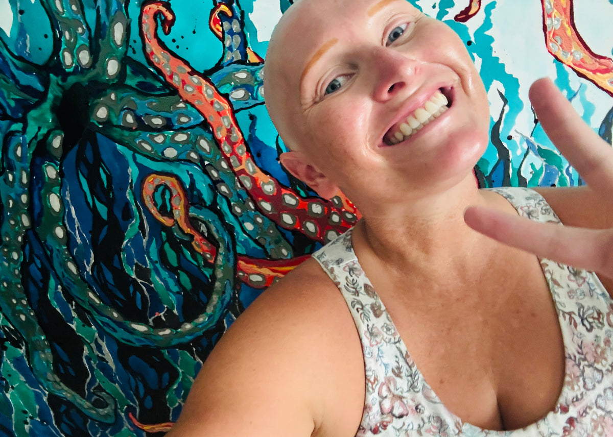 Several years ago, when my hair fell out with my alopecia, I wanted to feel good in my outfits and focus on something other than having every single hair on my body fall out. At the time, I was going to barre, and was teaching tennis while spending nights and weekends painting in Asheville's River Arts District. I had the idea to put one of my paintings on leggings, and went for it! The very first pair was Rainbow He'e, and I wore them to barre and got so many compliments and questions where they could get a pair.